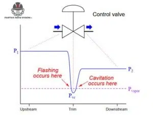 به همین ترتیب اگر سیال عبوری از شیر کنترل یک مایع باشد و فشار مطلق آن به کمتر از فشار بخار آن برسد مایع به جوش آمده